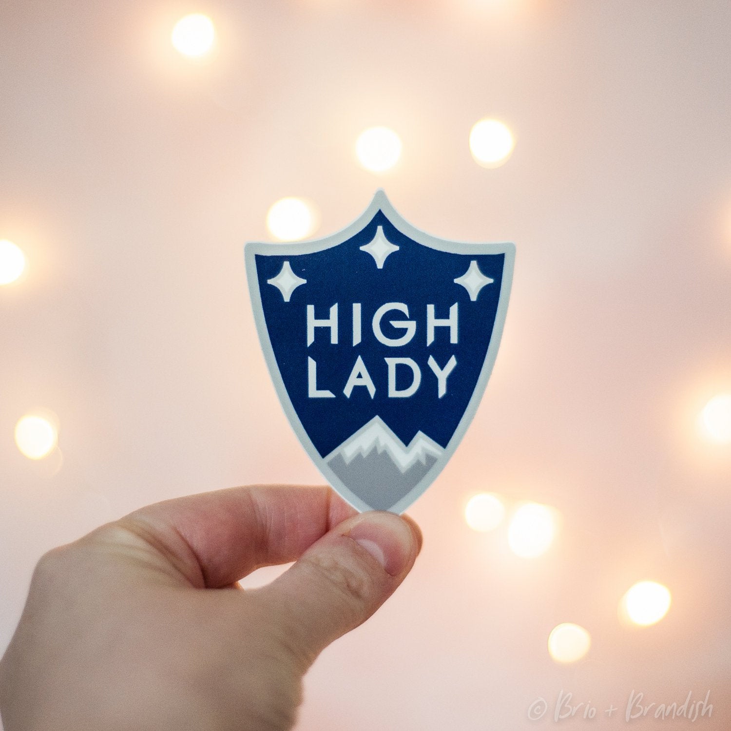 Let the world know that you are High Lady of the Night Court with this high-quality shield-shaped vinyl sticker featuring the mountain and stars of the Night Court on a midnight blue background.