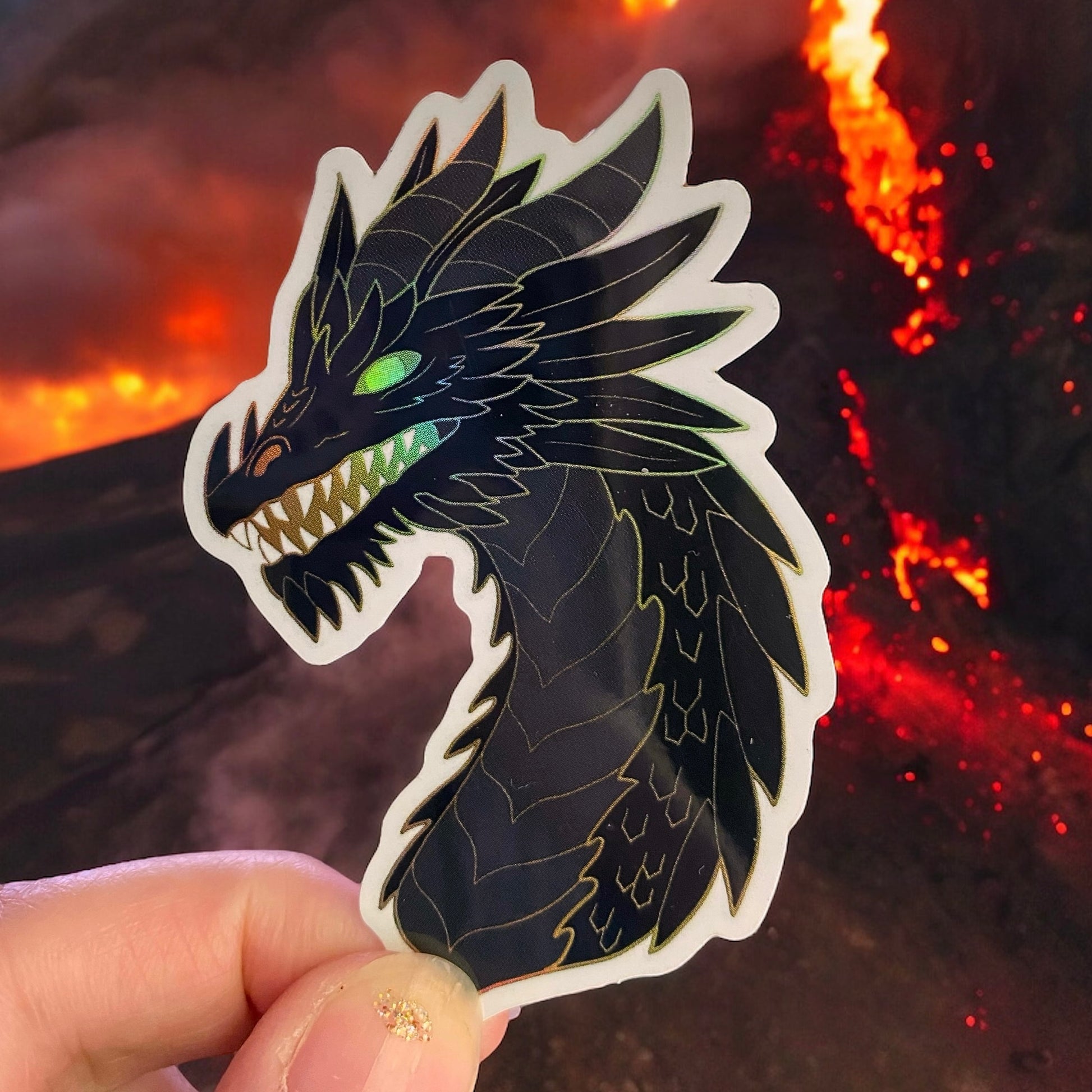 This is a 3" tall heavy duty waterproof vinyl sticker that has a shiny holographic finish. Perfect for laptops, water bottles, even your car!