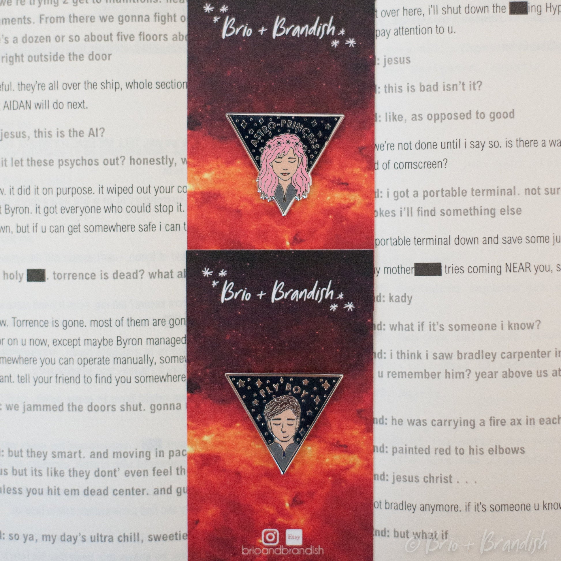 THIS IS A 2-PIN SET featuring Astro-Princess/Kady Grant and Fly Boy/Ezra Mason from the Illuminae Files.