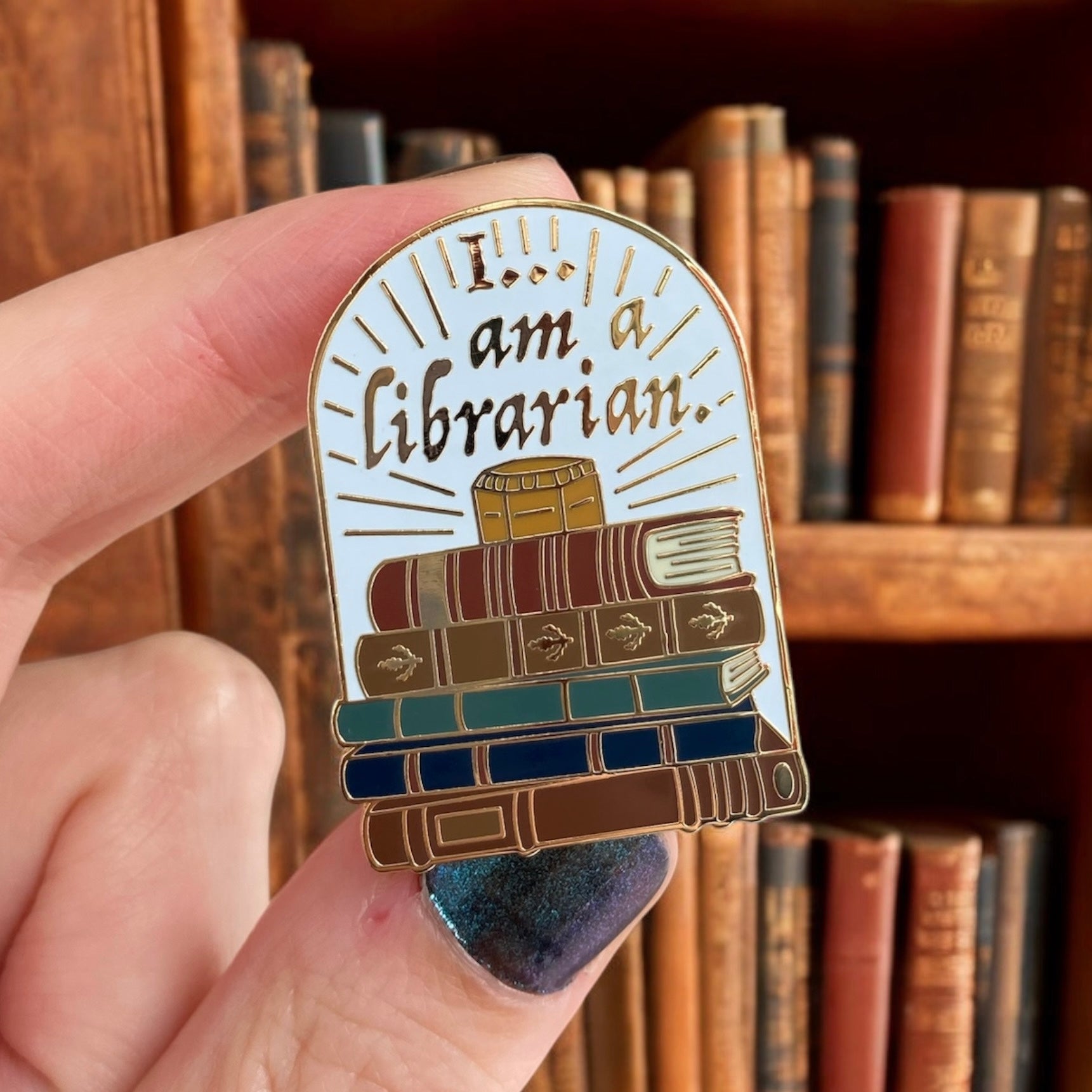 This listing is for 1 Librarian Enamel Pin, which stands approx. 1.5 inches tall/wide and is comprised of various hard enamels and gold nickel plating, polished to a high finish.