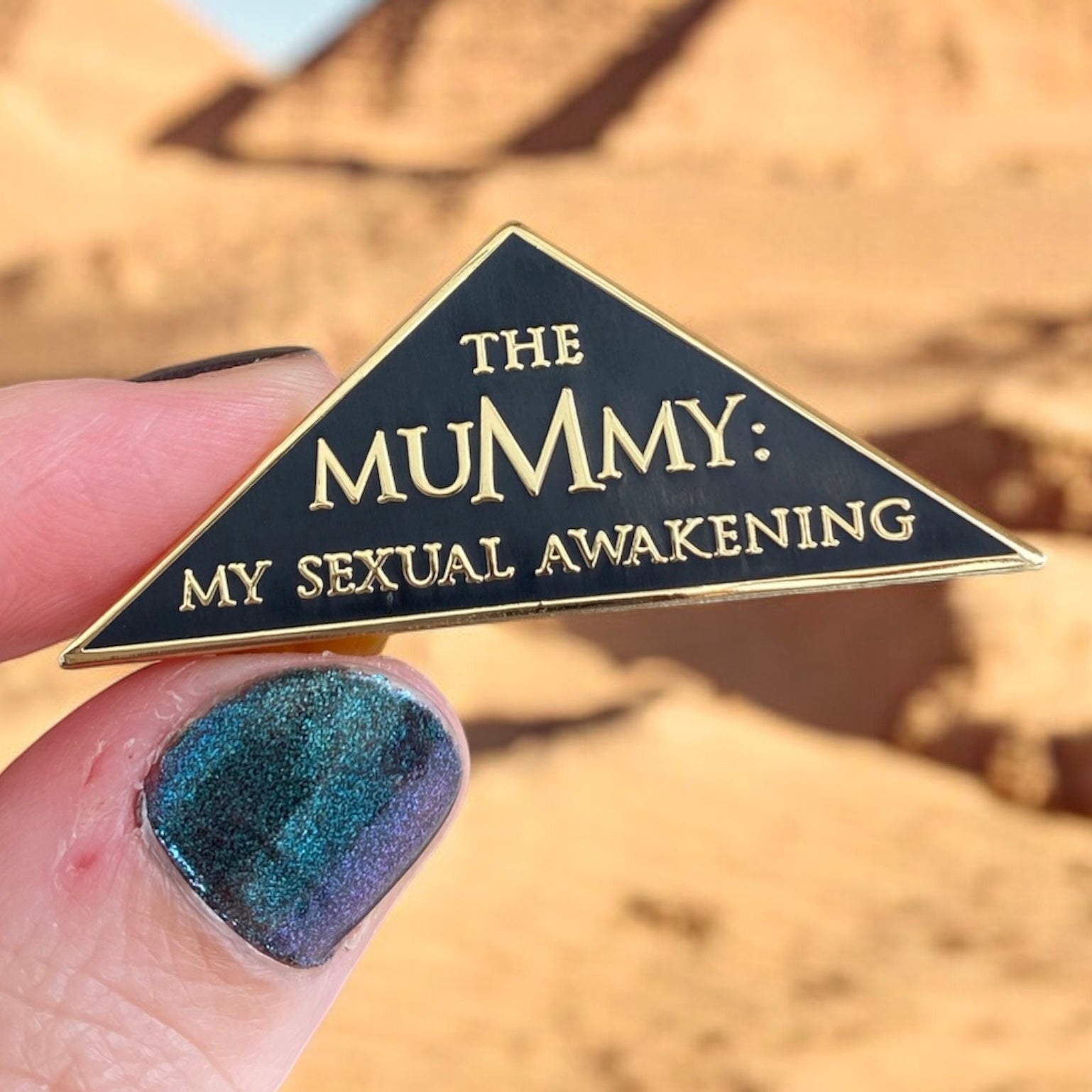 This listing is for 1 Mummy Awakening Enamel Pin, which stands approx. 1.5 inches tall/wide and is comprised of various hard enamels and gold nickel plating, polished to a high finish.